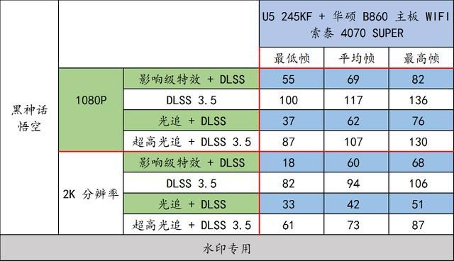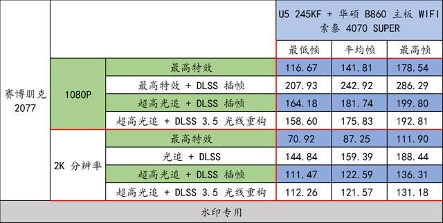 通过实测可以看到 u5 245kf + 华硕 b860 重炮手 wifi + 索泰 rtx4070 super 的组合就算在 2k 分辨率下开启超级光追与 dlss 3.5 光纤重构,游戏也能获得非常出色的游戏流畅性!