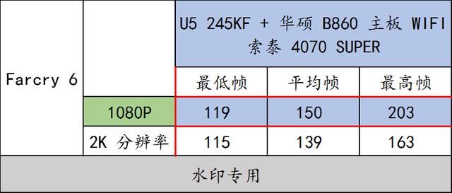 ▲ 《farcry 6》游戏 benchmark 实测,u5 245kf + 华硕 b860 重炮手 wifi + 索泰 rtx4070 super 的组合可以在 2k 分辨率下非常流畅地运行游戏,深入沉浸享受游戏。