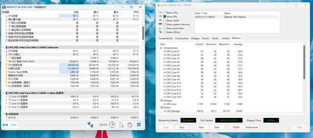 ▲ aida 64 单钩 fpu 满载实测功耗最大值为 142.026 w,比起 14600kf 低了很多了。最高温度也仅有 60 ℃,可以说进步巨大了。