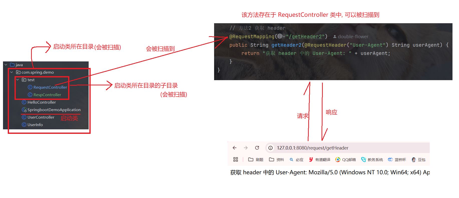 若请求中资源路径对应的方法, 属于启动类所在目录或子目录时, 会被 spring 扫描到: