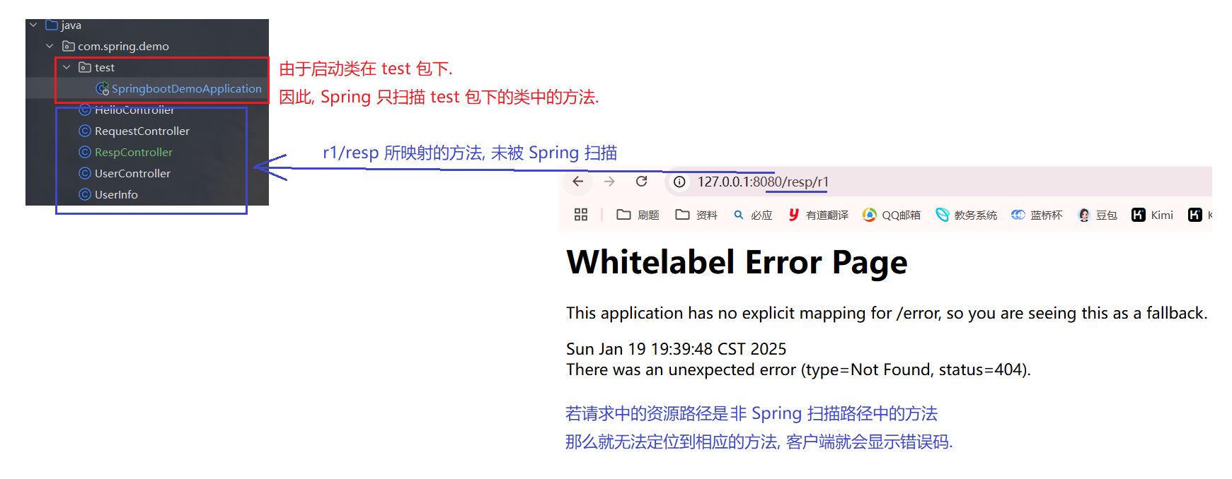 而当请求中资源路径所对应的方法, 不属于启动类所在目录或子目录时, 则 spring 不会扫描, 客户端就会显示错误: