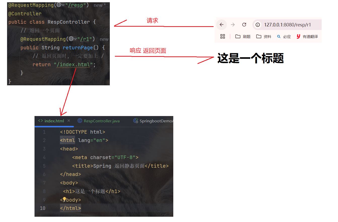 我们首先使用 html 写一个前端页面, 再通过 spring 方法, 将这个 html 页面作为响应的内容, 展示给用户.