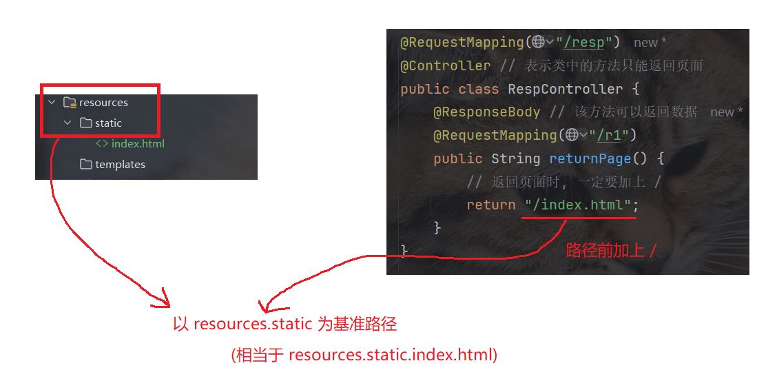 spring 会以 resources.static 为该 html 文件的基准路径, 扫描指定路径下的 html 文件, 并返回该 html 构造的页面. 并且, html 文件的路径前要加上 /