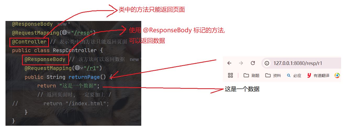 当类注解为 @controller 时, 类中的方法只能返回页面, 若此时我们想返回数据, 可以对方法使用 @responsebody 进行标记, 被标记的方法可以返回数据.