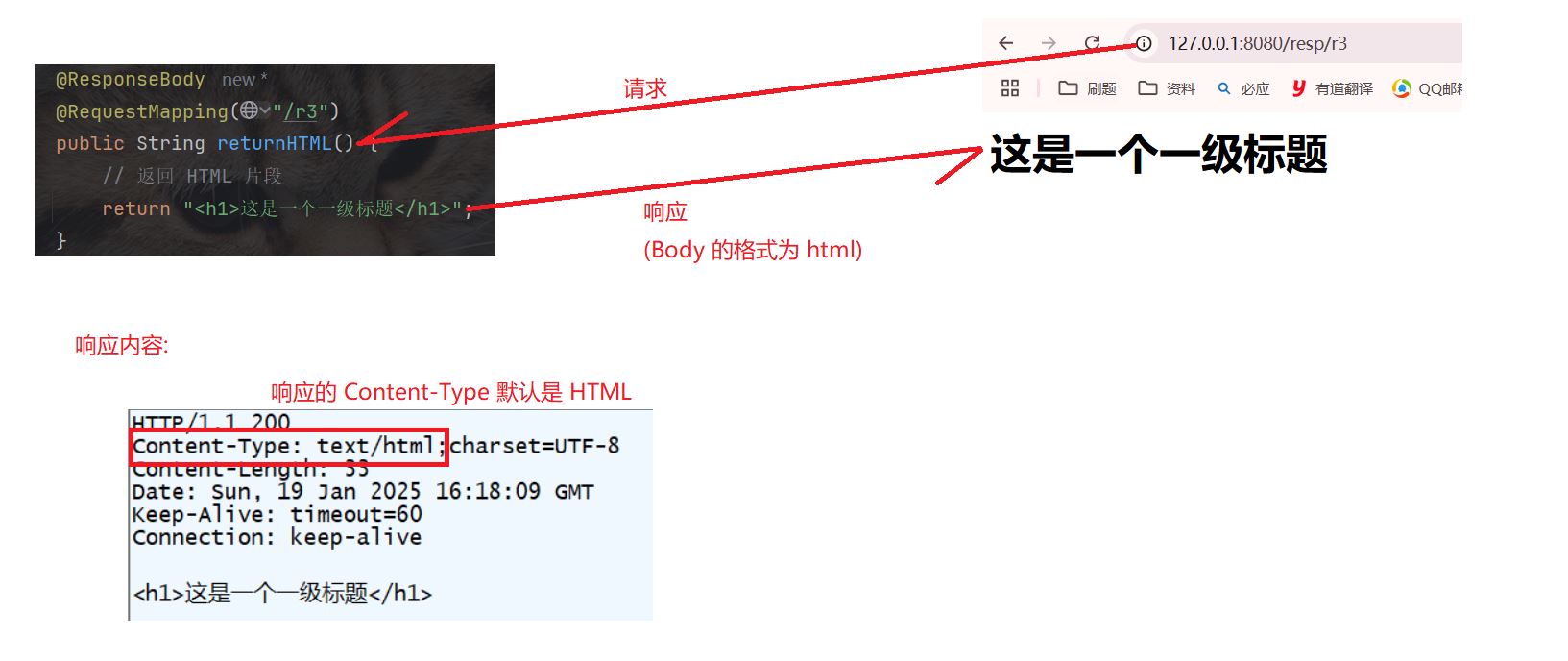 这样, 浏览器接收响应后, 就会将 body 中的内容, 以纯文本的格式来解析, 而不是当做 html .
