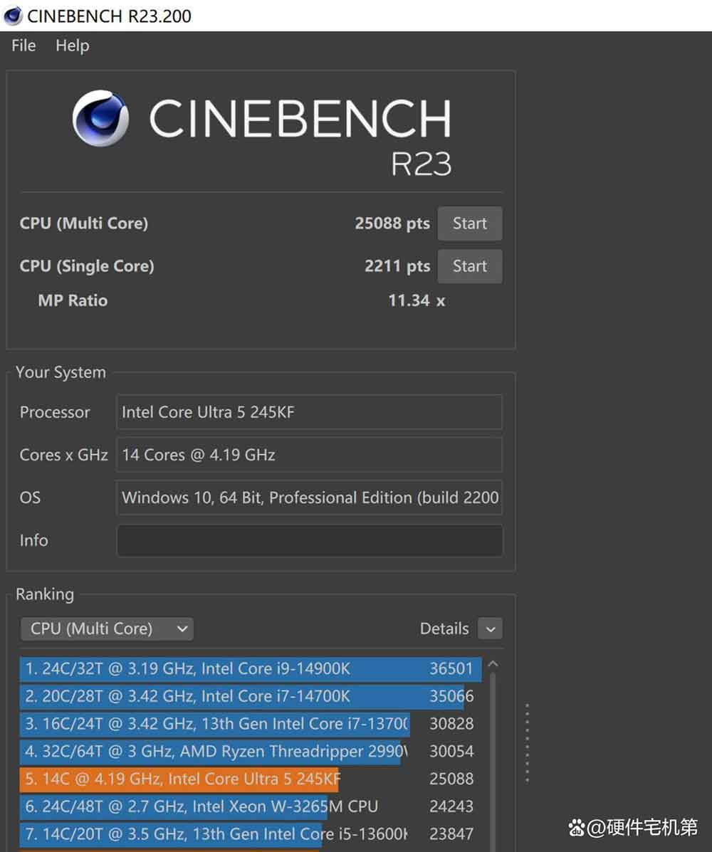 cinebench r23基准测试,在该测试中,intel ultra 5 245kf无论单核性能还是多核性能,都是优于上一代的14600kf的。