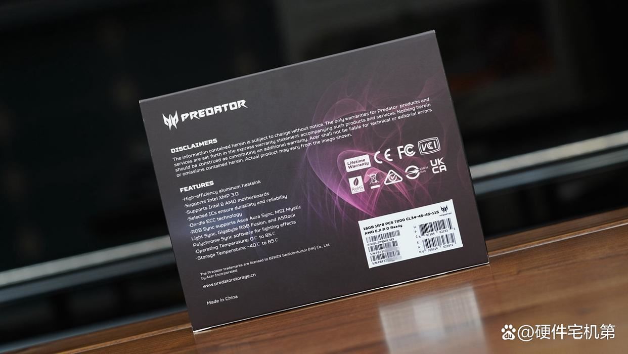 对于i平台来说,还是比较吃内存带宽的,尤其是这一代采用了分离式模块架构,导致其通讯延迟有所增加,所以这一代的cpu更吃内存带宽了。为了进一步弥补短板,释放性能,就需要高频率的内存来进行补强,这里选择了宏碁掠夺者 hera影锋 ddr5 7200 32g(16g×2)掠光限定版,该内存采用特挑海力士原厂颗粒,7200mhz的高频也能助力cpu打破性能禁锢,进一步释放平台性能,同时内存做工精湛,灯效炫酷,非常适合组建高性能主机。