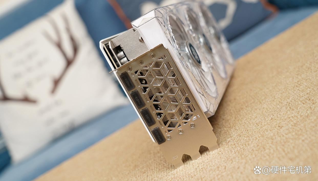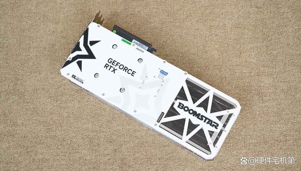 显卡背部采用非常吸睛的白色铝合金背板设计,不仅颜值高,还能增强显卡强度,辅助显卡散热;背板尾端采用大面积镂空设计,能够进一步增强散热通透性,提高散热效能。
