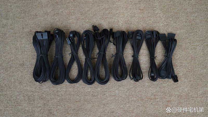 电源标配了数量充足的高档压花模组线,其中16pin pcie5.1显卡供电线也是标配。