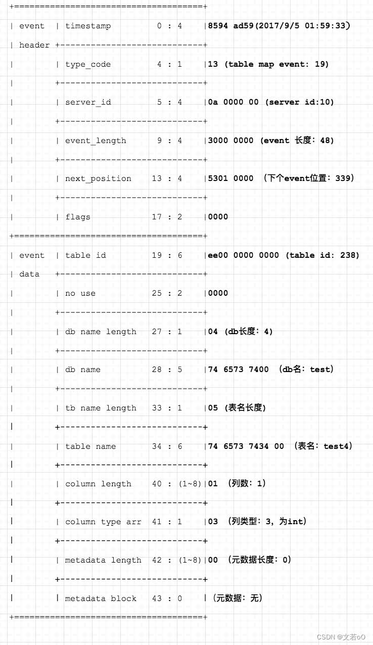 读取头信息后,我们就可以通过 next_position 跳到下一个事件开始的位置,读取事件头,如果遇到 table_map 事件则表示要开启一个 dml 事务,那么 table map 事件中存储的是什么呢?