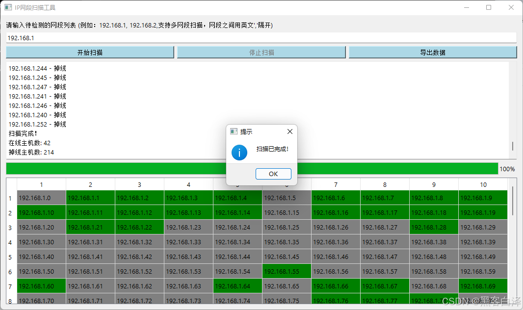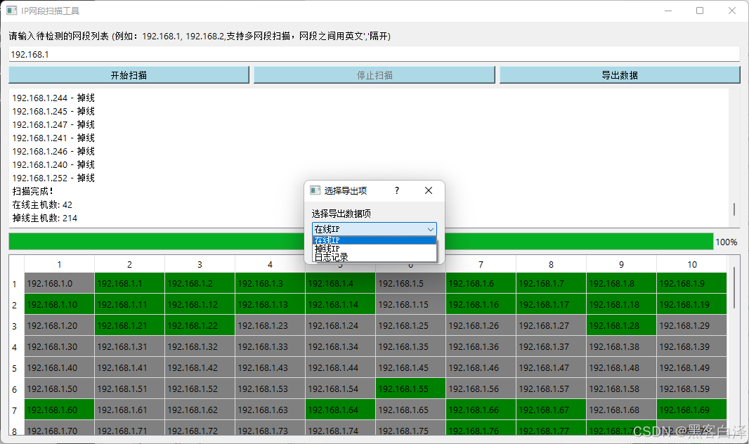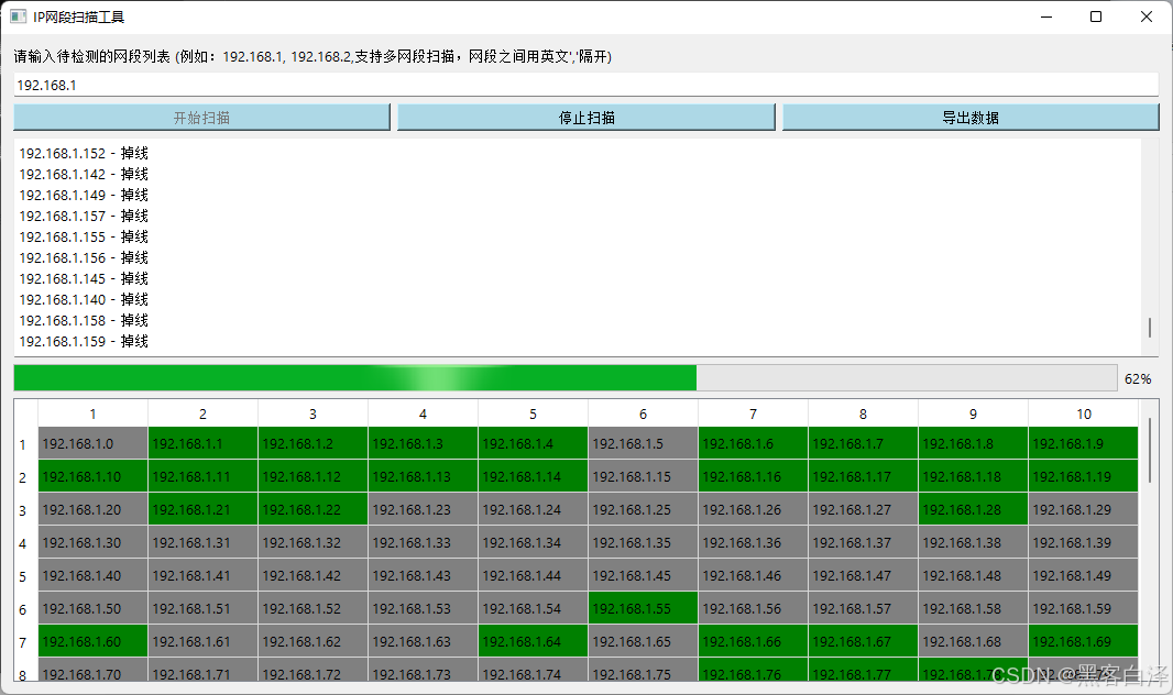 用户可以通过输入网段(如 192.168.1,192.168.2)来启动扫描。工具会自动生成每个网段下的所有ip,并开始对每个ip进行ping操作,快速检测其在线状态。