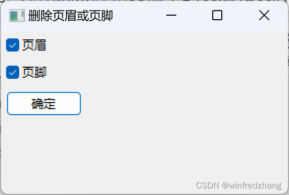 # 创建复选框和按钮 self.header_checkbox = wx.checkbox(panel, label="页眉") self.footer_checkbox = wx.checkbox(panel, label="页脚") self.delete_button = wx.button(panel, label="确定") # 绑定按钮点击事件 self.delete_button.bind(wx.evt_button, self.on_delete)