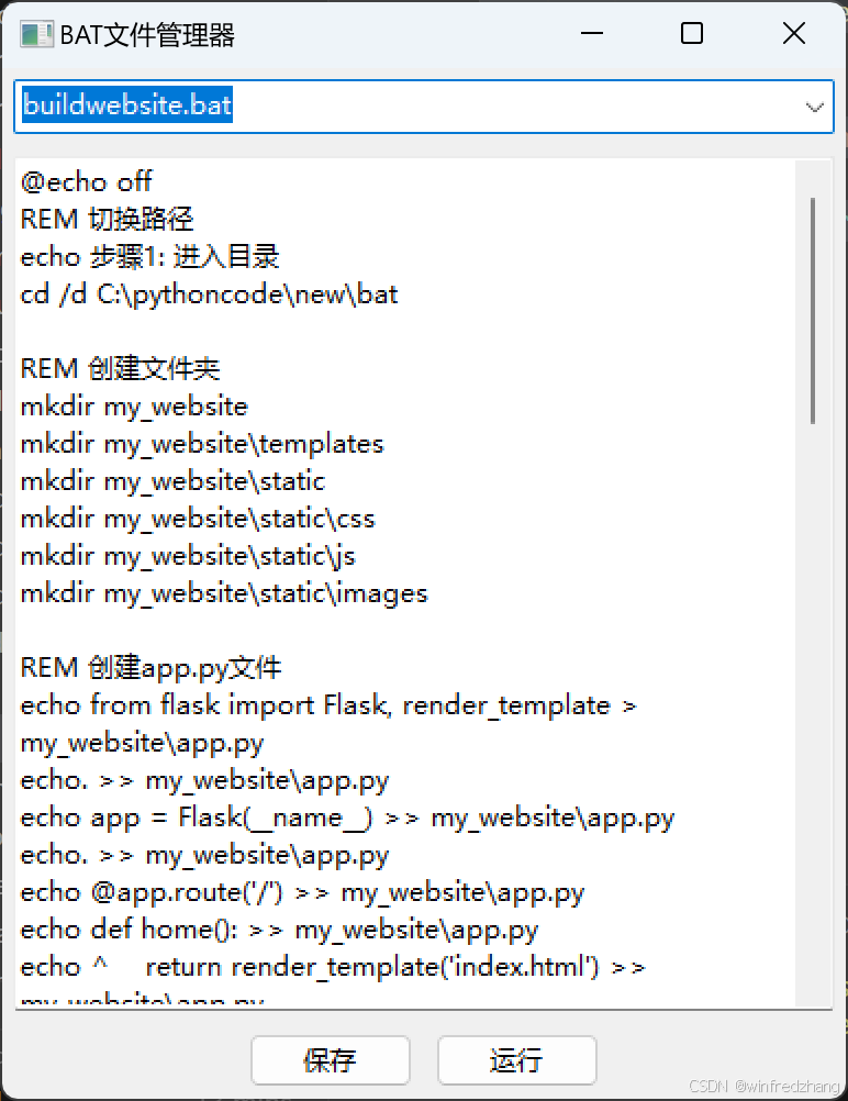 - 保存文件(on_save方法): - 将文本区域的内容保存为.bat文件。
