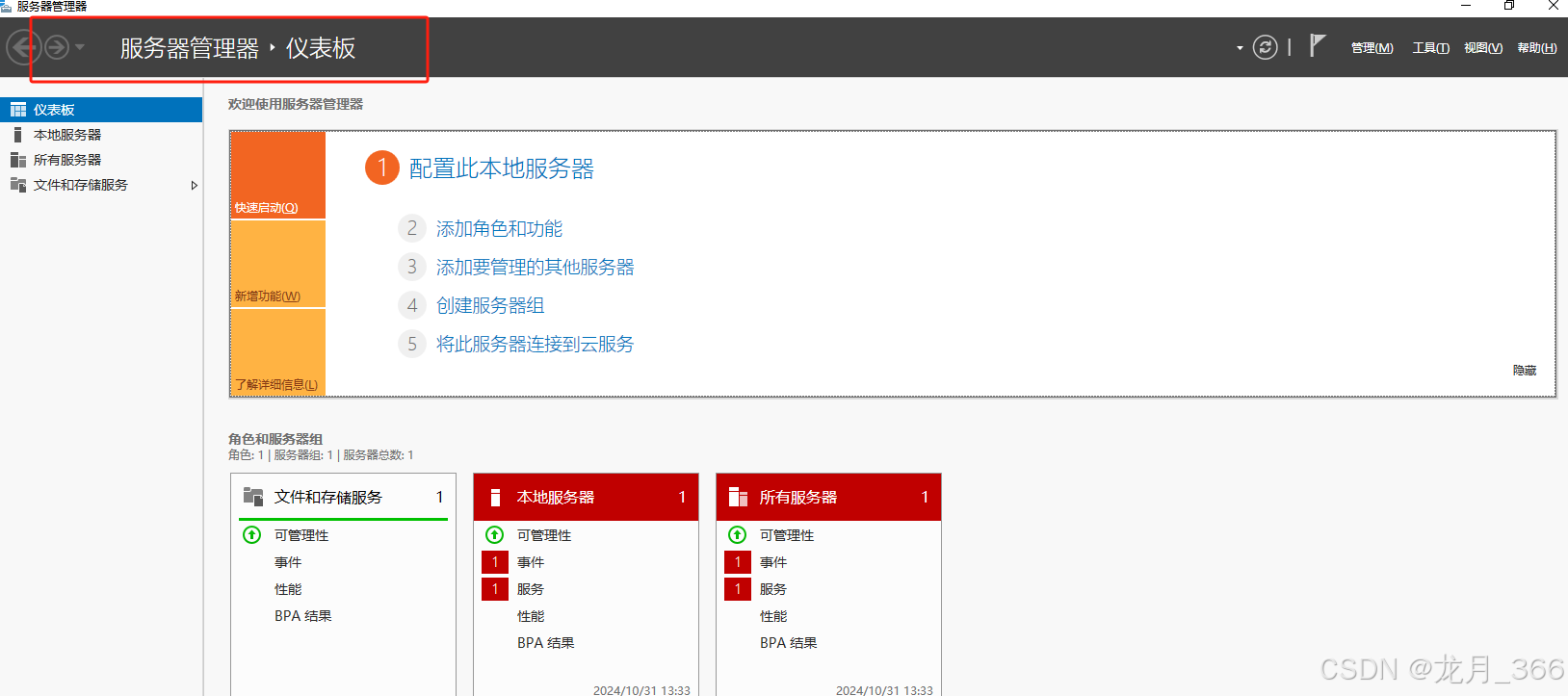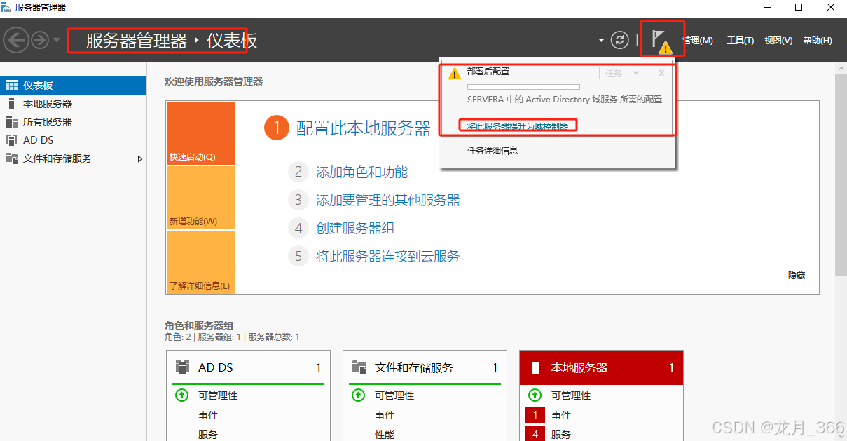 1、打开“服务器管理器仪表板”,点击右上角的“带感叹号的小旗”,然后点击“将此服务器提升为域控制器”;