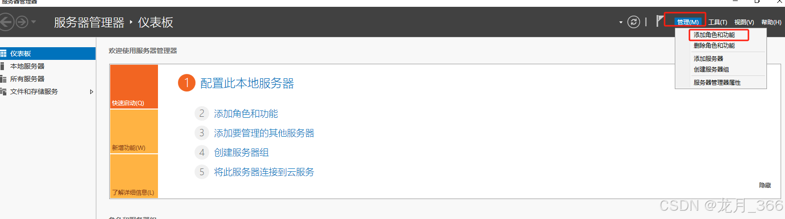 2、点击右上角的“管理”,选择“添加角色和功能”;