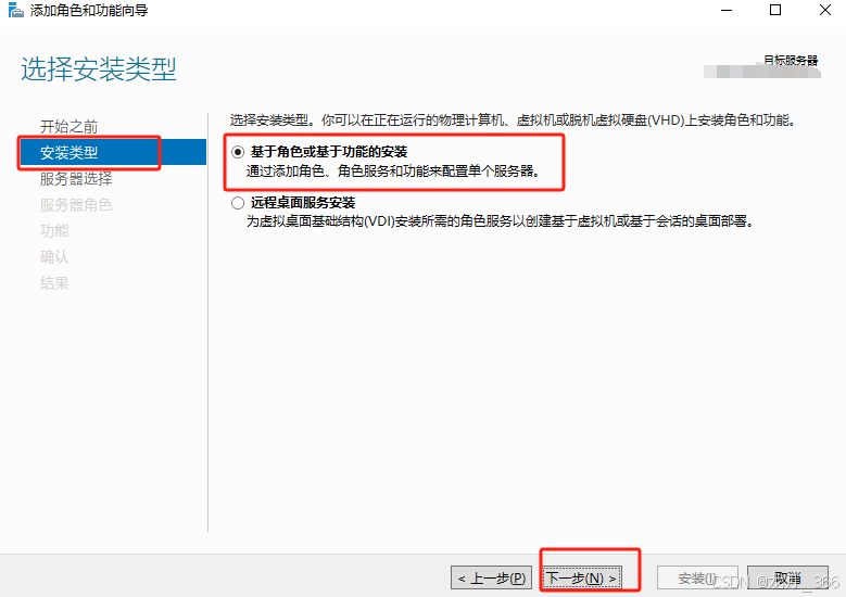 4、安装类型,选择“基于角色或基于功能的安装”,点击“下一步”;