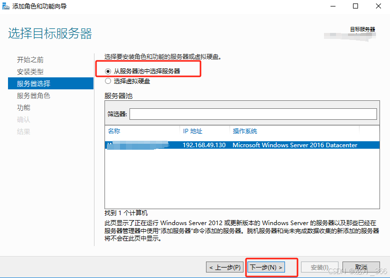 5、服务器选择,选择“从服务池中选择服务器”,点击“下一步”;