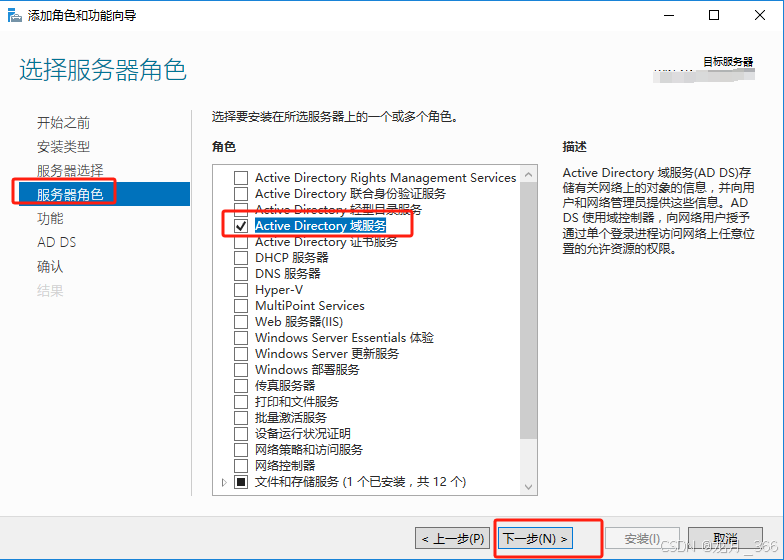 6、在“服务器角色”,勾选“active directory 域服务”,然后点击“下一步”;