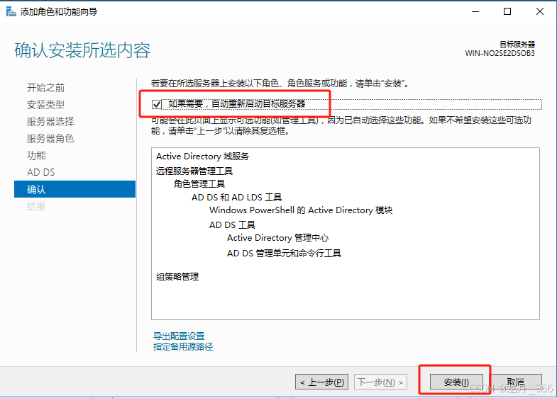 9、在“确认”,勾选“如果需要,自动重新启动目标服务器”,然后直接点击“安装”;
