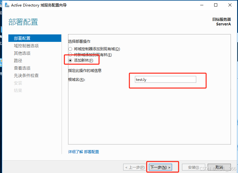2、在“部署配置”,选在“添加新林”,在根域名添加“test.ly”,然后点击“下一步”;