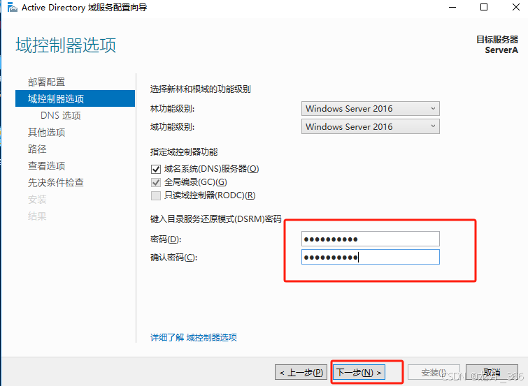 3、在“域控制器选项”,新录入密码并保证两次密码一直,然后点击“下一步”;
