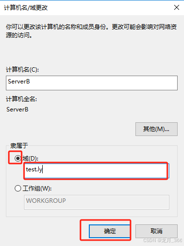 3、打开“计算机名/域更改”界面,选择则“域”,输入“test.ly”,然后点击“确认”;