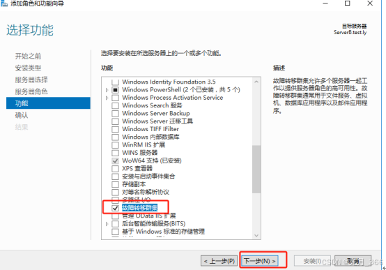 6、在“功能”上,选择“故障转移群集”,然后点击“下一步”;