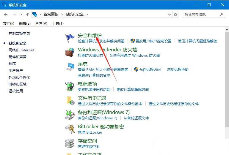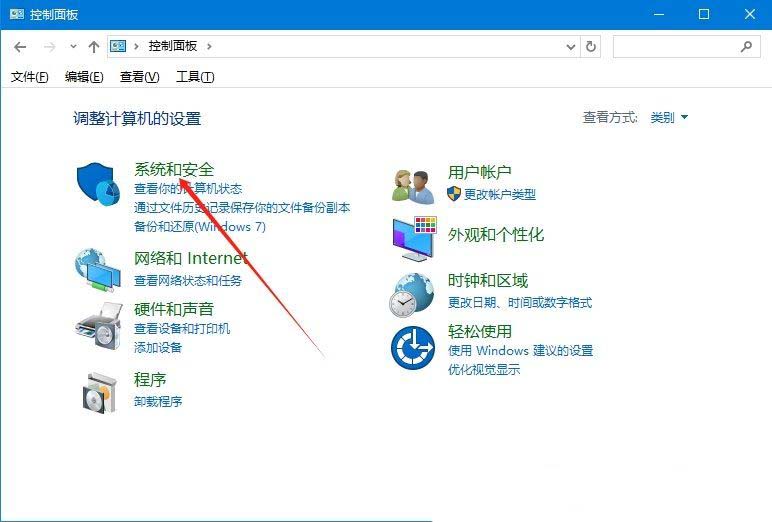 1、首先,打开win10系统的控制面板界面,点击进入到“系统和安全”设置。