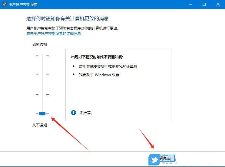 4、随后,把始终通知拉到最底的从不通知即可,再点击确定。