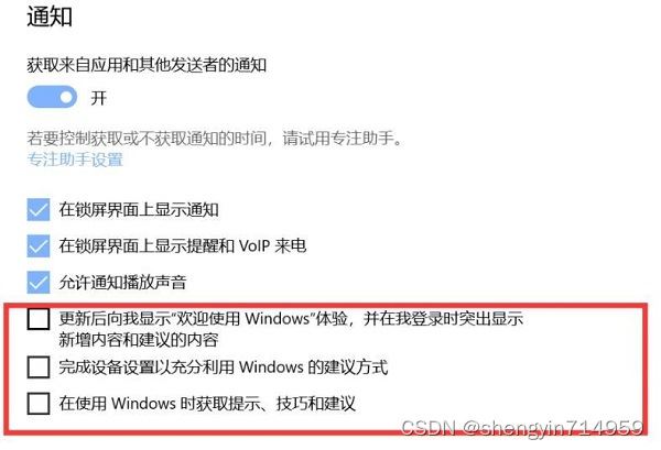2、将图中框里的三个选项全部关闭。这样微软就不会再给你发送提示信息啦。