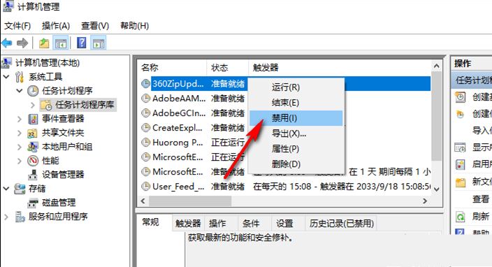5. 我们右键单击该选项,然后在菜单列表中选择“禁用”选项,将“任务计划程序库”页面中的所有选项都设置为禁用即可。