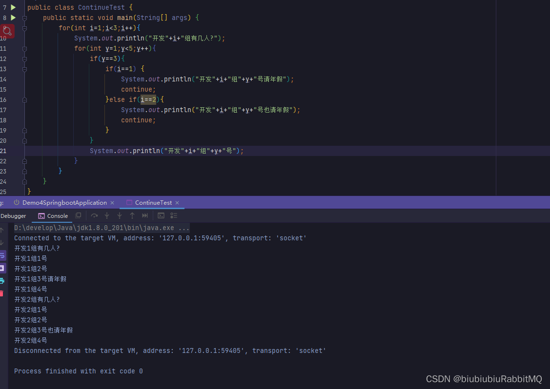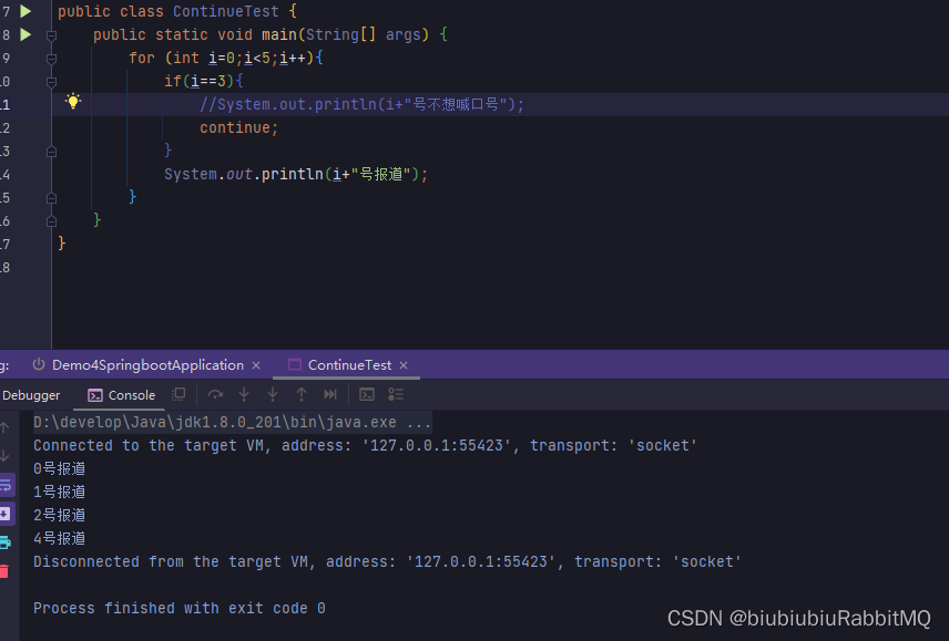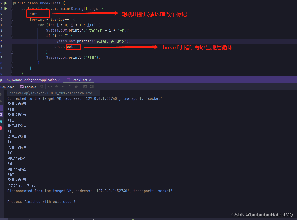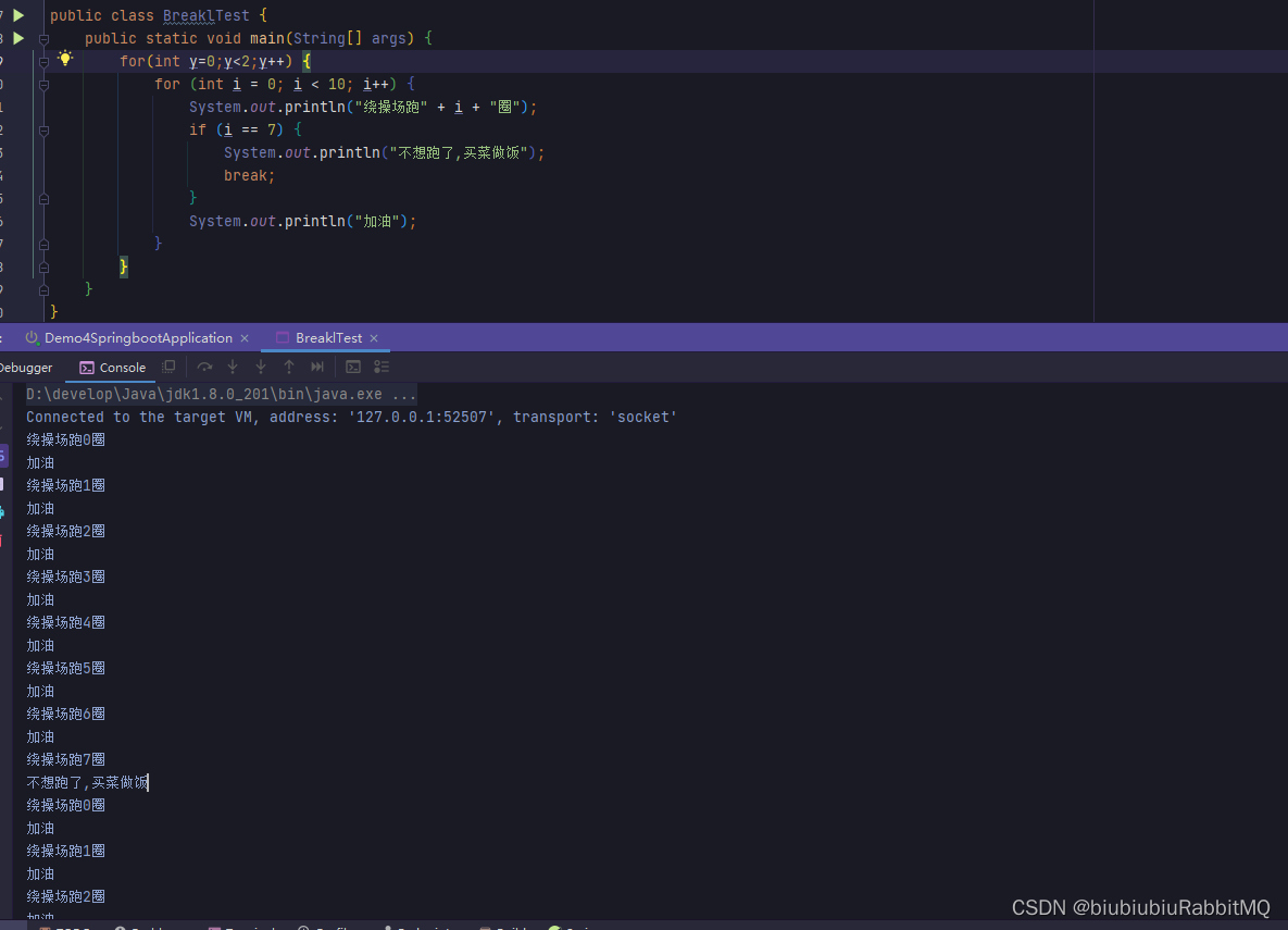 break用于完全结束一个循环,跳出循环体。不管是哪种循环,一旦在循环体中遇到break,系统将完全结束循环,开始执行循环之后的代码。 break不仅可以结束其所在的循环,还可结束其外层循环。此时需要在break后紧跟一个标签,这个标签用于标识一个外层循环。java中的标签就是一个紧跟着英文冒号(:)的标识符。且它必须放在循环语句之前才有作用。