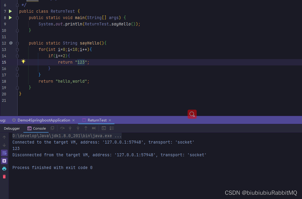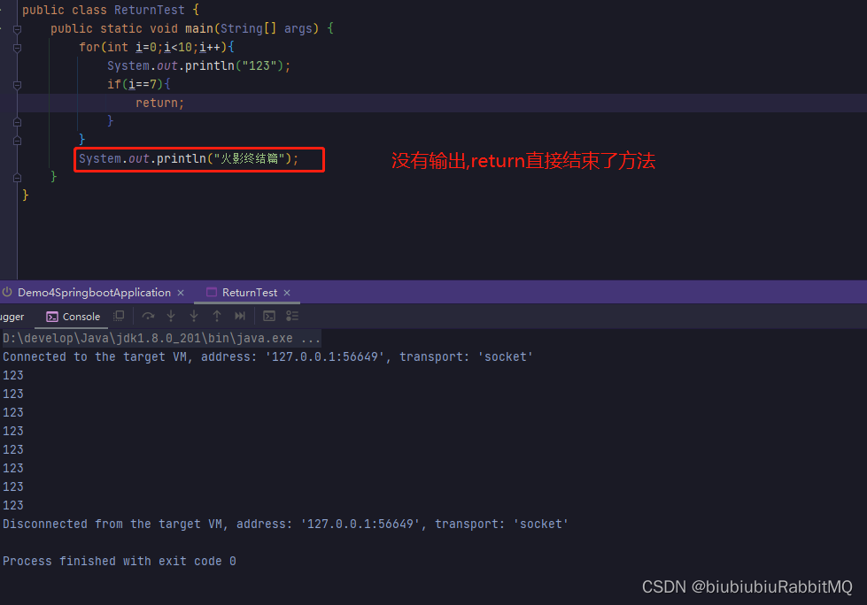 return关键字并不是专门用于跳出循环的,return的功能是结束一个方法。 一旦在循环体内执行到一个return语句,return语句将会结束该方法,循环自然也随之结束。与continue和break不同的是,return直接结束整个方法,不管这个return处于多少层循环之内。