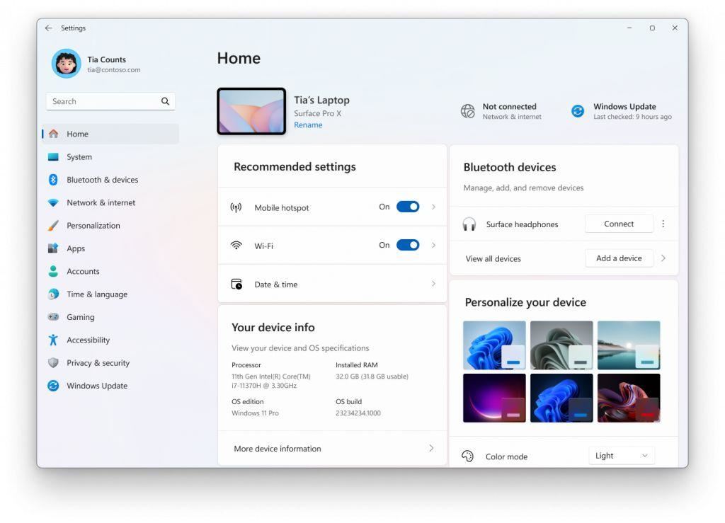 微软开始为 it 管理员管理的 pc 上的商业客户推出设置主页。该功能将显示一些与企业管理 pc 相关的现有卡片,如 "推荐设置" 和 "蓝牙设备",以及两张新的企业特定设备信息和辅助功能偏好卡片。