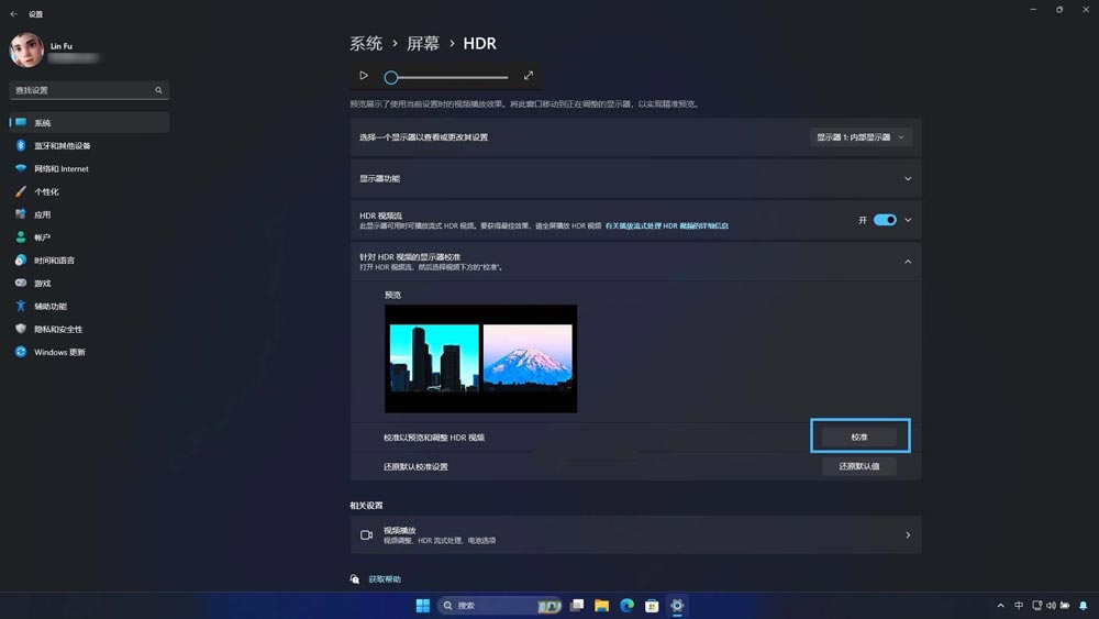 1、点击「校准以预览和调整 hdr 视频」旁边的「校准」按钮。