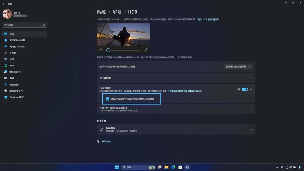 虽然 hdr 视频流能带来更好的显示效果,但它也会增加耗电量。你可以根据需要,选择是否勾选「当我的电脑使用电池运行时关闭 hdr 视频流」。