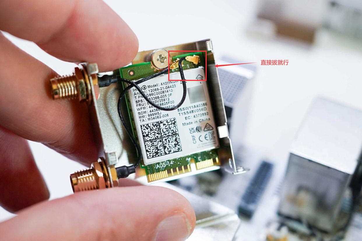 通过拆解可以看到,板载的无线网卡是m.2形态,并非焊接,后期更换只需要拆装螺丝+天线就行,比较简单。
