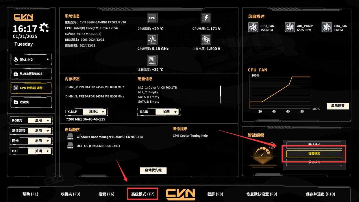 七彩虹b860i登陆舰仅8pin的cpu供电,所以手动超频空间很小,解锁调试项目先得在bios首页切换成性能模式,之后按f7将页面切换成高阶模式。
