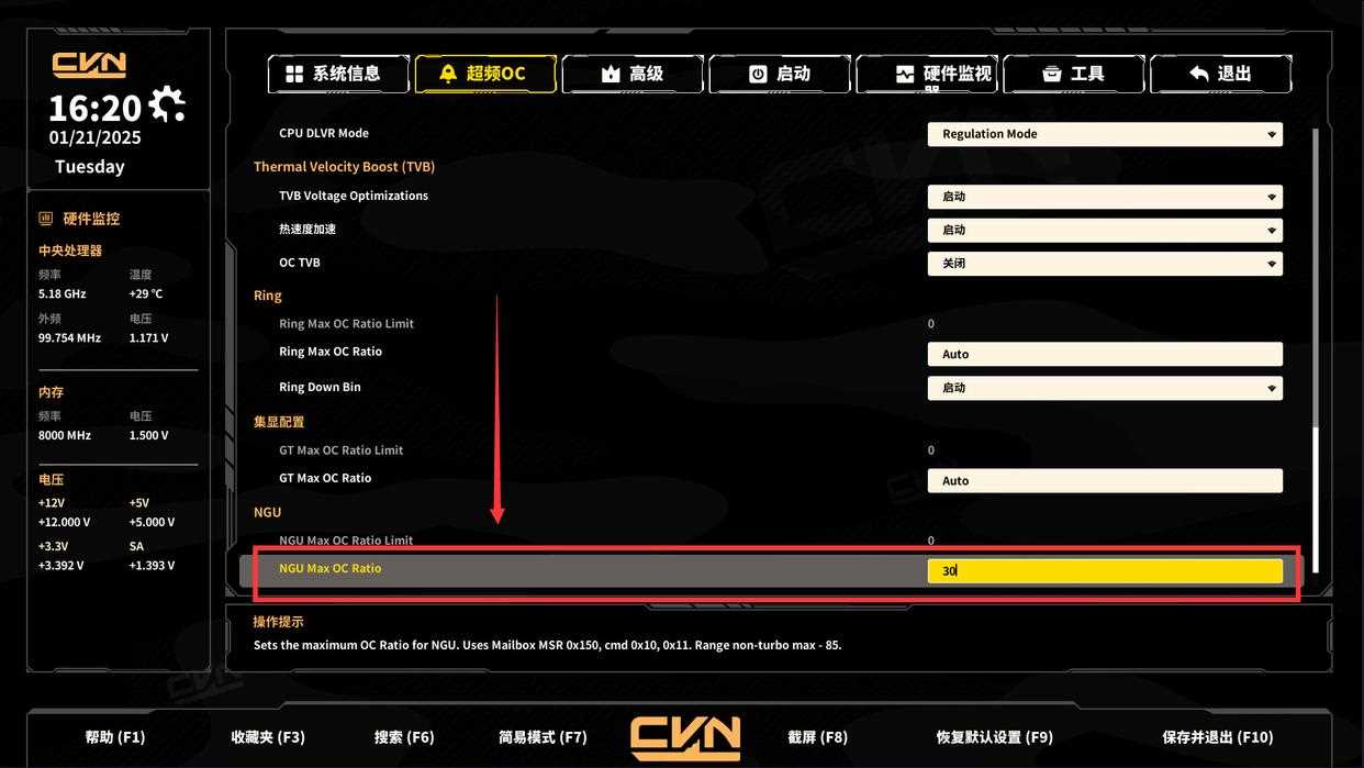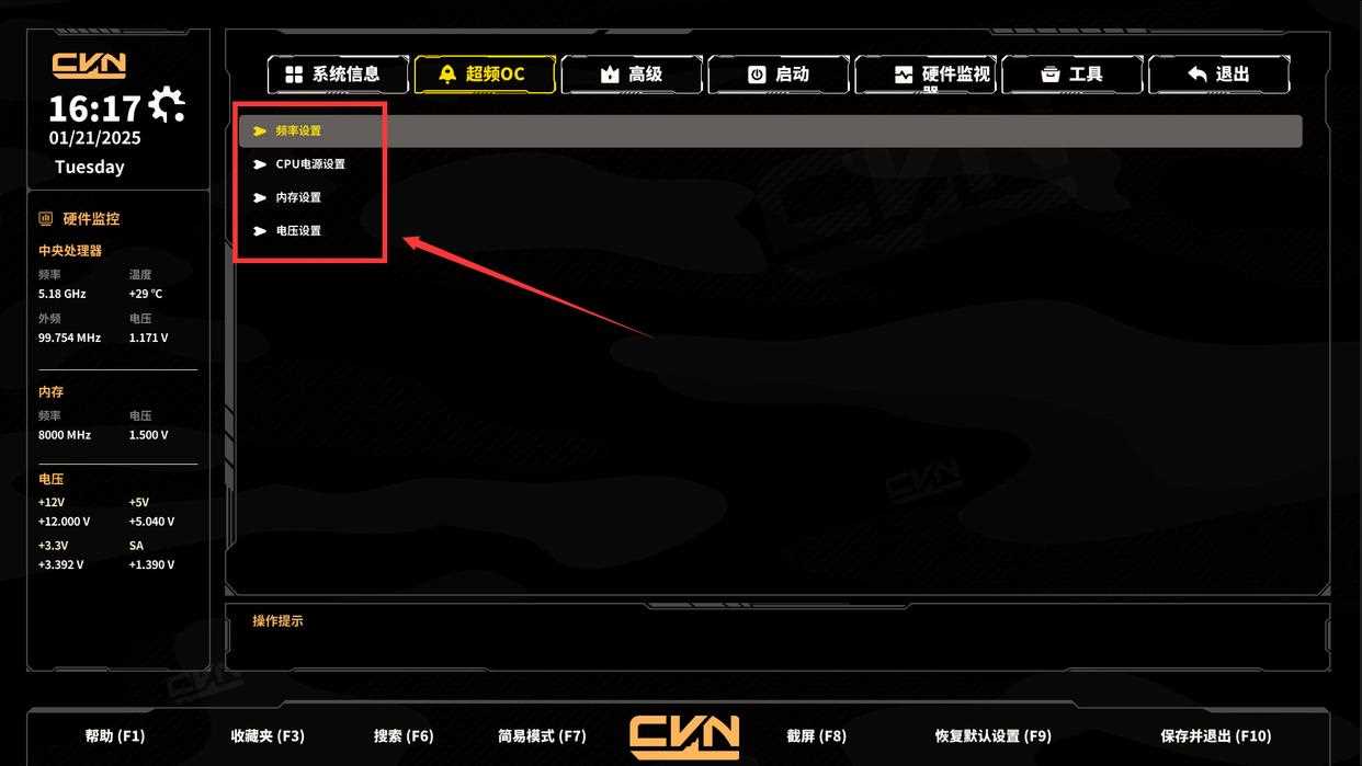 主要调整都在超频oc页面,简单说一下下面四个分类对应的功能: