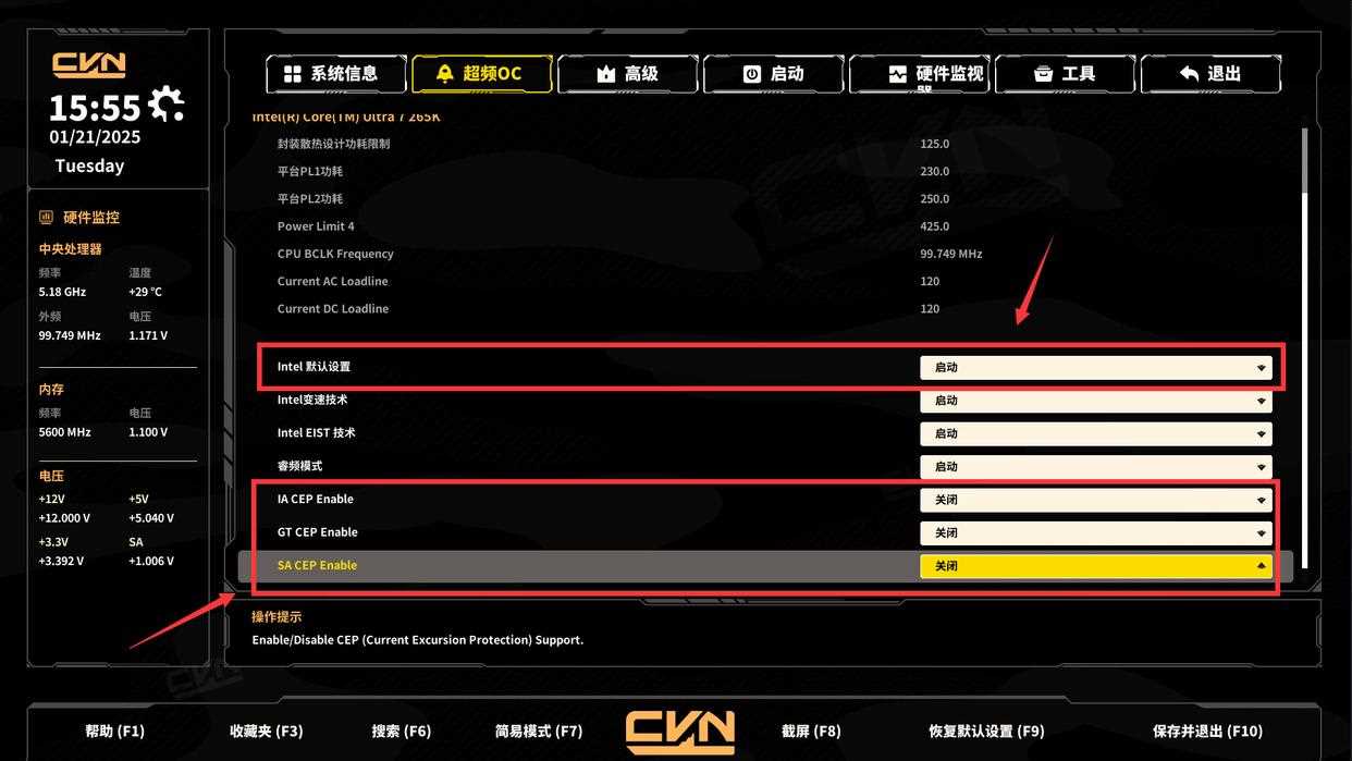 - 三项cep(电流激增保护)默认开启,一般不用动,手动超频建议关闭。