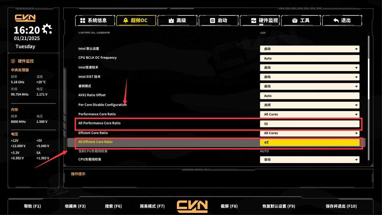 但是,我测试这张主板的时候遇到了问题,压力测试只能到5.2ghz+4.6ghz,问了下其他玩家,有些能稳定5.5ghz+4.6ghz,这也是为什么开头建议搭配245k的原因。