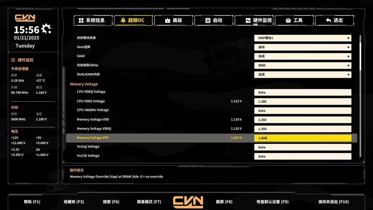 内存就没有特别要介绍的了,相比老版bios,频率、时序和电压都在一个页面就能配置完。我也出过七彩虹z890超频8600mhz的教程,点比较多,这里就不再赘述了。