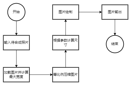 上述是图片的合成流程图,实现的过程都是比较简单,没有外部的依赖,完全使用java的原生基础api实现。主要的计算步骤包括:1、读取输入的待合成照片;2、加载读取的图片并计算最大宽度;3、等比例压缩图片;4、根据参数计算尺寸;5、图片的绘制;6、图片输出。