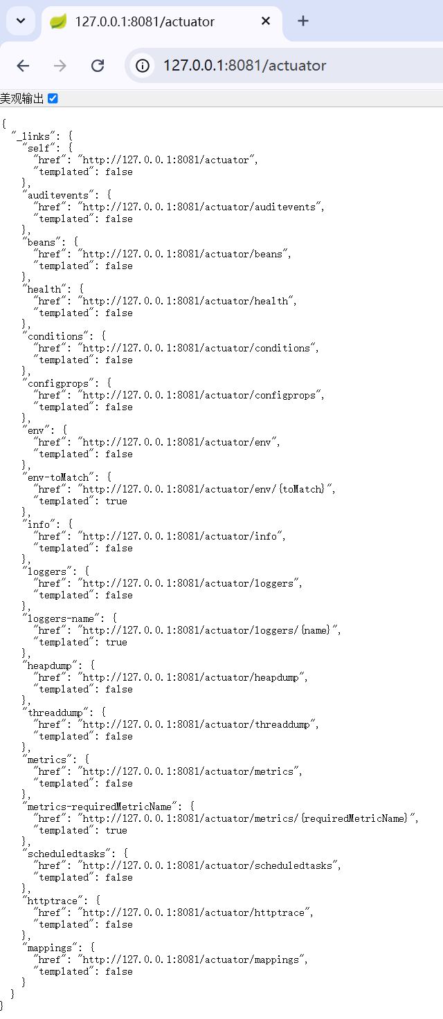include: "*"启动项目,浏览器输入:http://127.0.0.1:8081/actuator,可见以下接口信息