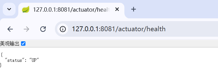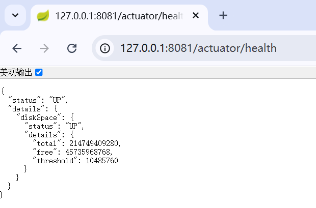 输入某个详细的接口名称,如:http://127.0.0.1:8081/actuator/health,查询详细的内容,如下: