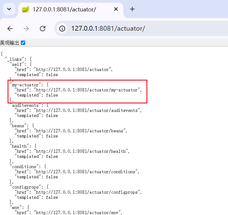 浏览器输:http://127.0.0.1:8081/actuator/my-actuator,可见接口返回