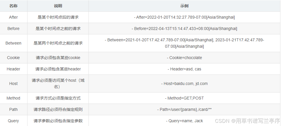 predicates: # 路由断言,判断请求是否符合路由规则的条件