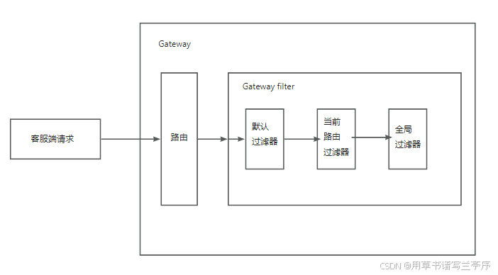 客户端请求先找到路由,路由匹配时经过过滤器层层筛选,最终访问到微服务。
