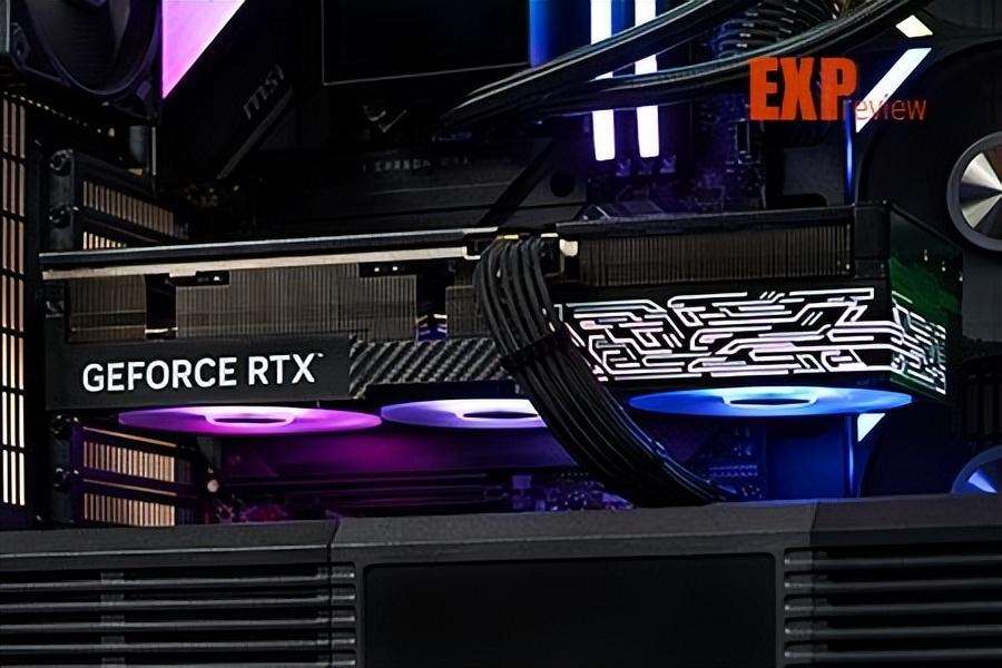 显卡通电亮灯后的样子,除了侧面的炫彩rgb灯外,正面的三把风扇也是自带argb灯效的,显卡的灯效都可与使用12v-2x6旁的灯光同步口与主板的argb口相连,与主板灯效同步。