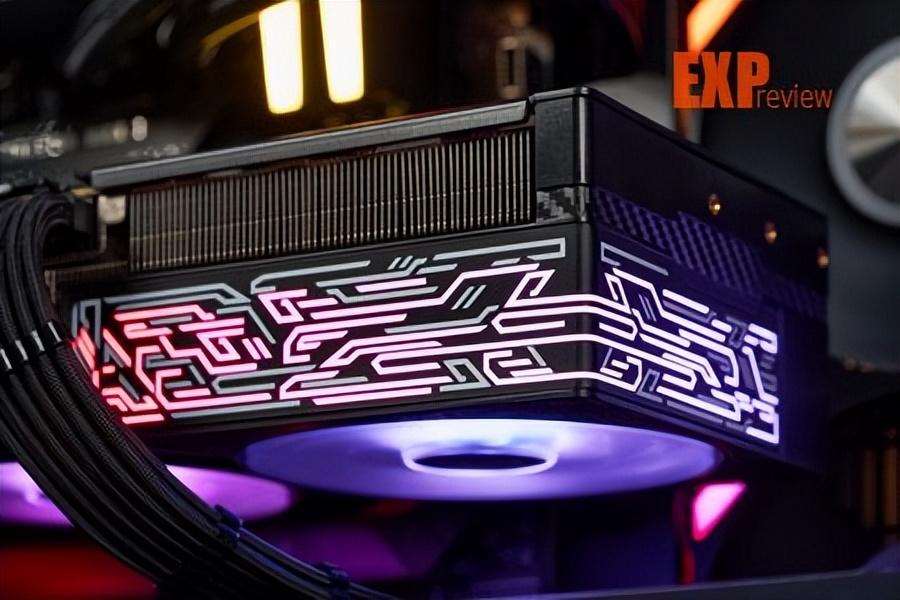 散热器的整流罩采用旭日黑铠主题设计,黑色主体搭配彩光展现了机械与艺术的融合,黑色碳纤维纹路与几何线条交错布置,整体风格简约且极具科技感。侧面镶嵌有炫彩rgb灯效,以流线型的电路图案为装饰,进一步突出赛博科技风格。